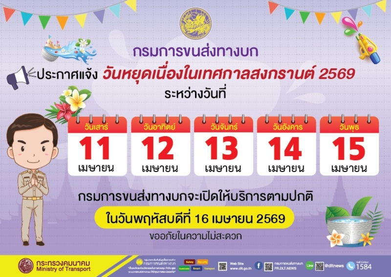 ปฏิทินวันหยุดราชการ/ วันหยุดเนื่องในเทศกาลสงกรานต์ 2569 ระหว่างวันที่ 11 - 15 เมษายน 2569 โดยกรมการขนส่งทางบก จะเปิดให้บริการตามปกติ ในวันที่ 16 เมษายน 2569
