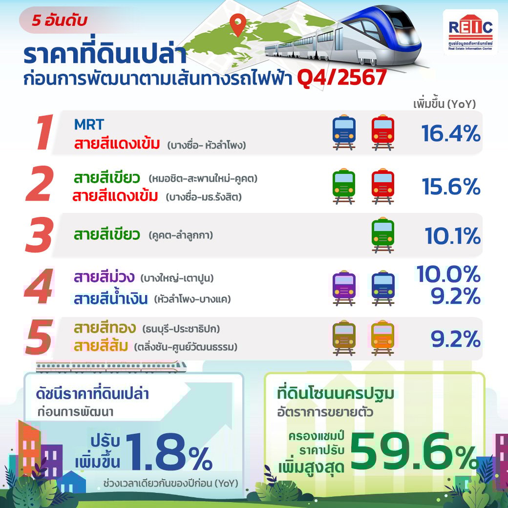 ทั้งนี้ REIC ยังได้จัดอันดับราคาที่ดินเปล่าก่อนการพัฒนาในแนวเส้นทางที่มีรถไฟฟ้าผ่าน พบว่าทำเลที่มีอัตราการขยายตัวของราคาที่ดินเพิ่มขึ้นสูงสุดเมื่อเทียบกับไตรมาสเดียวกันของปีก่อน (YoY) ส่วนใหญ่เป็นที่ดินที่มีโครงการรถไฟฟ้าเปิดให้บริการแล้ว และเป็นทำเลที่มีสถานีเชื่อมต่อระหว่างสถานีรถไฟฟ้าหรือสามารถเดินทางเชื่อมถึงกันได้ง่าย โดย 5 อันดับแรกที่มีอัตราการขยายตัวของราคาที่ดินเพิ่มขึ้นสูงสุด ประกอบด้วย