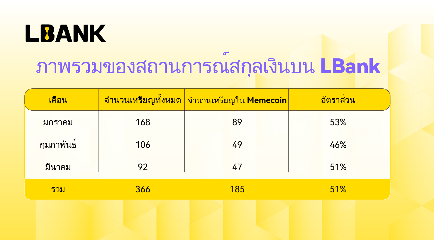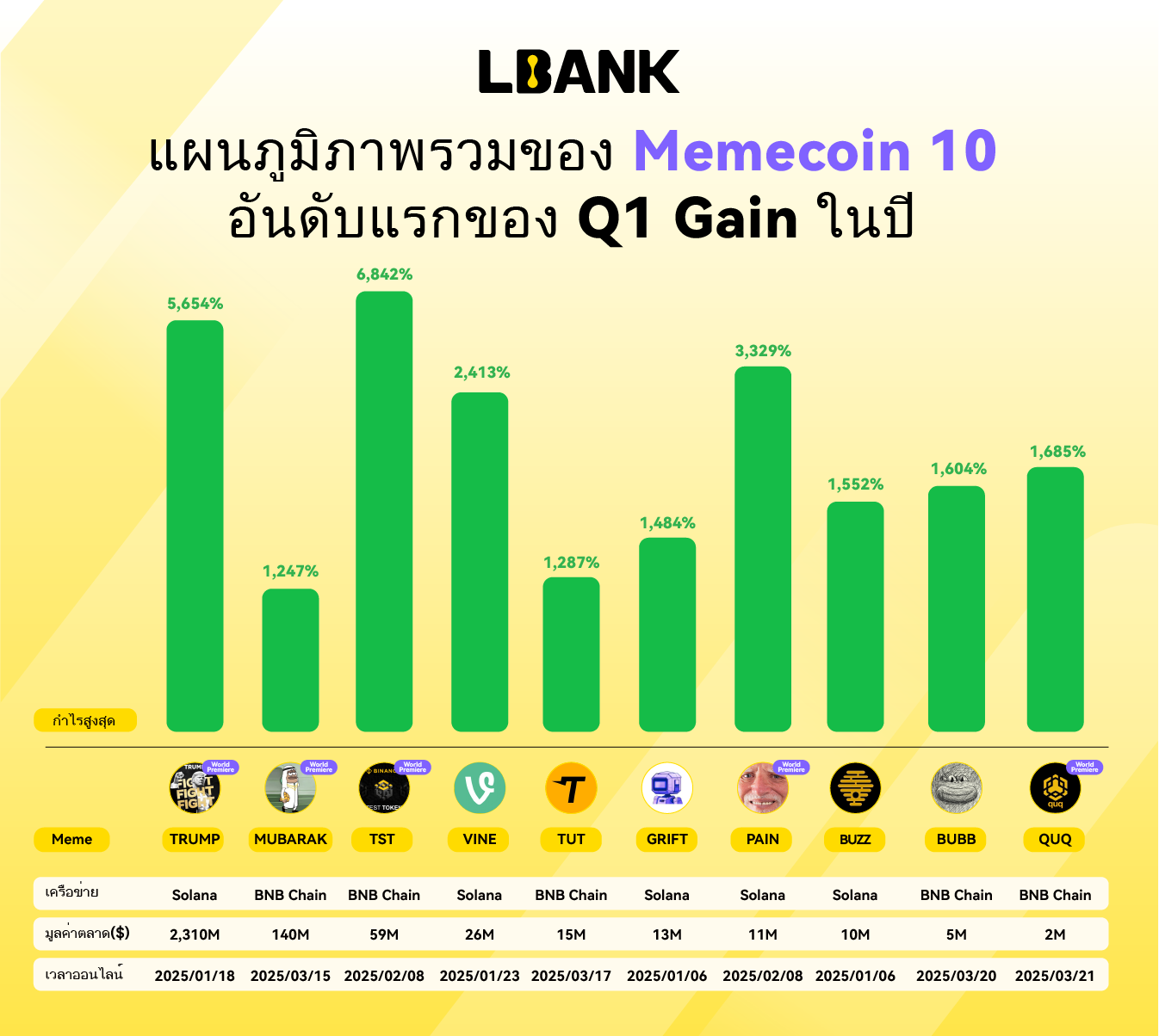 ในช่วงไตรมาสที่ 1 ปี 2025 LBank ได้ลิสต์สินทรัพย์ใหม่ 366 รายการ โดย 185 รายการ (51%) เป็นเหรียญ Memecoin ซึ่งสะท้อนถึงความมุ่งมั่นของแพลตฟอร์มต่อสินทรัพย์ดิจิทัลประเภทนี้ โดยเฉพาะเหรียญ Memecoin บางตัวที่ทำกำไรได้อย่างมหาศาล อาทิ $TST พุ่งขึ้นถึง 6,842%, $TRUMP เพิ่มขึ้น 5,654%, $PAIN พุ่งขึ้น 3,329% และ $VINE เพิ่มขึ้น 2,413% นอกจากนี้ เหรียญ $GRIFT ยังโดดเด่นที่สุด โดยครองส่วนแบ่งตลาดถึง 54% ซึ่งมากกว่าคู่แข่งรายอื่น ๆ ในตลาดแบบรวมศูนย์ และสะท้อนถึงความเป็นผู้นำของ LBank ในตลาด Memecoin.