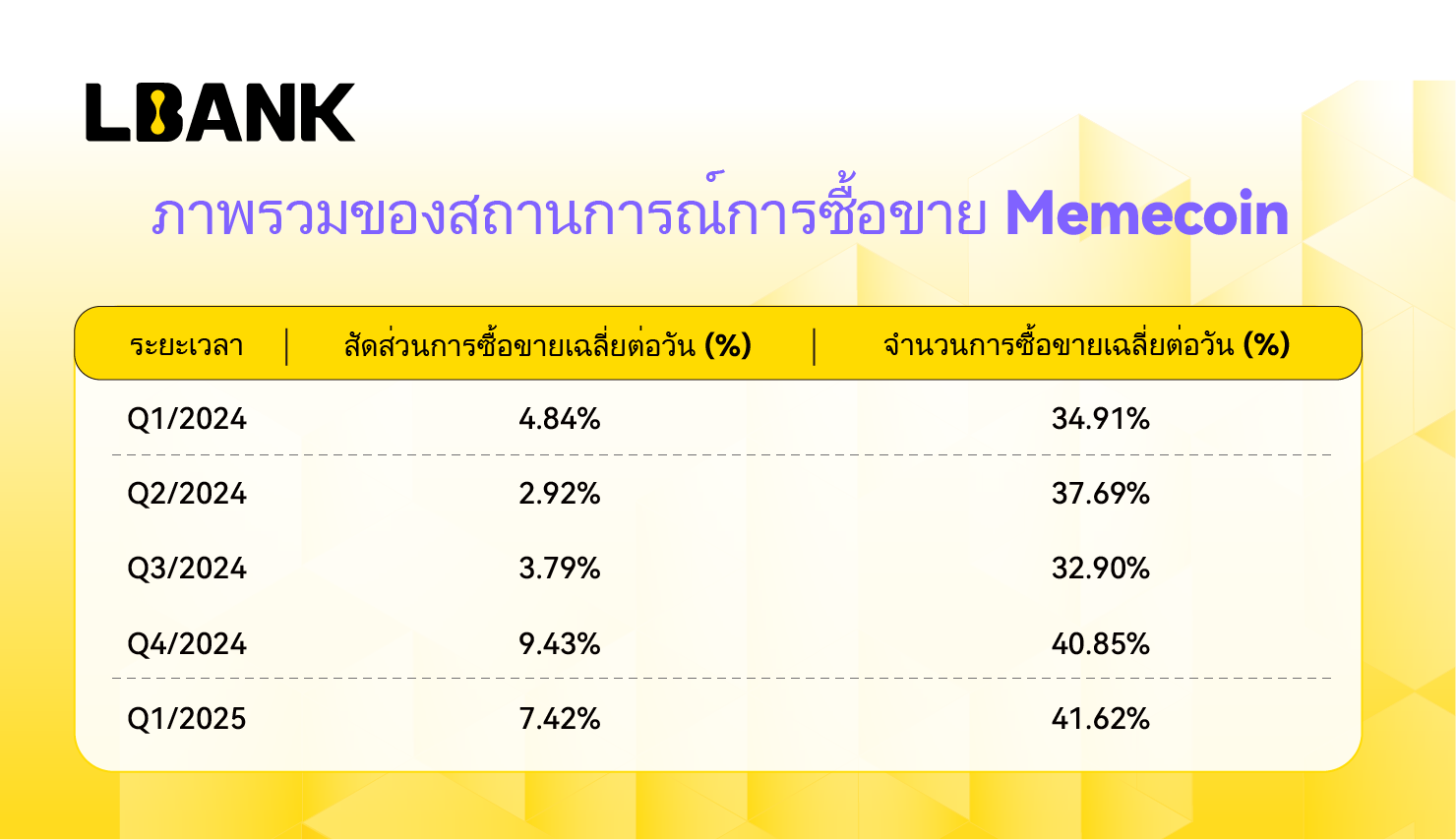LBank ไม่เพียงแต่มอบสภาพคล่องที่เพียงพอ แต่ยังช่วยให้นักลงทุนสามารถซื้อขายได้อย่างราบรื่น แม้ในช่วงที่ตลาดมีความผันผวนสูง โดย ปริมาณการซื้อขาย Memecoin รายวันของ LBank เพิ่มขึ้นจาก 4.84% ในไตรมาสที่ 1 ปี 2024 เป็น 7.42% ในไตรมาสที่ 1 ปี 2025 ในขณะเดียวกัน สัดส่วนของผู้ซื้อขาย Memecoin บนแพลตฟอร์มก็เพิ่มขึ้นจาก 34.91% เป็น 41.62% แสดงให้เห็นถึงความนิยมที่เพิ่มขึ้นของ LBank ในหมู่เทรดเดอร์สาย Memecoin การเติบโตนี้เป็นผลจากการวิเคราะห์ตลาดที่แม่นยำและกลยุทธ์การลิสต์สินทรัพย์ที่ยืดหยุ่นของ LBank ซึ่งช่วยให้แพลตฟอร์มกลายเป็นจุดหมายปลายทางหลักของนักลงทุนที่ต้องการซื้อขาย Memecoin