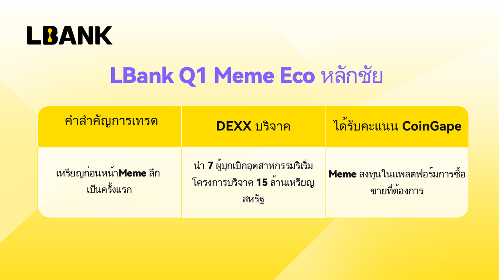 สิงคโปร์, 2 เมษายน 2025 – LBank (lbank.com) แพลตฟอร์มแลกเปลี่ยนสกุลเงินดิจิทัลชั้นนำระดับโลก ได้เผยแพร่รายงานไตรมาสที่ 1 ปี 2025 โดยแสดงให้เห็นถึงความสำเร็จอันโดดเด่นในตลาด Memecoin ซึ่งได้รับความสนใจอย่างมากจากนักลงทุน ด้วยศักยภาพและกลยุทธ์ที่แข็งแกร่ง LBank ได้สร้างมาตรฐานใหม่ให้กับอุตสาหกรรม และเสริมสร้างความน่าสนใจให้กับเทรดเดอร์และนักลงทุนทั่วโลก.